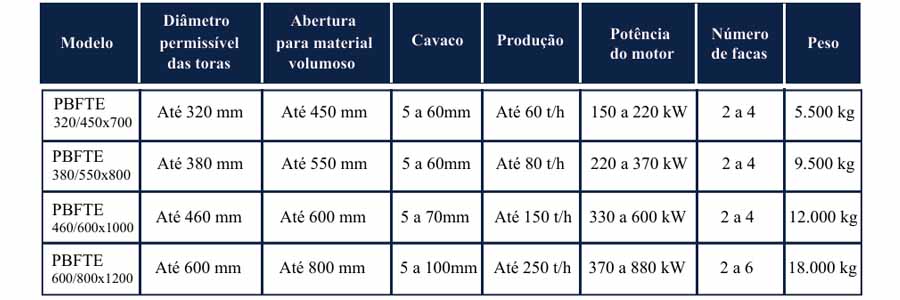 São quatro modelos, sendo o mais potente capaz de produzir até 250 t/h. Seu projeto otimizado conta com sistema de contra facas regulável e reafiável. Além da gama de materiais que podem ser processados, investir na linha PBFTE, traz uma série de benefícios, entre eles:
