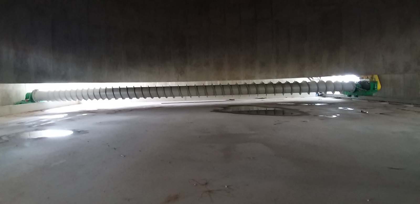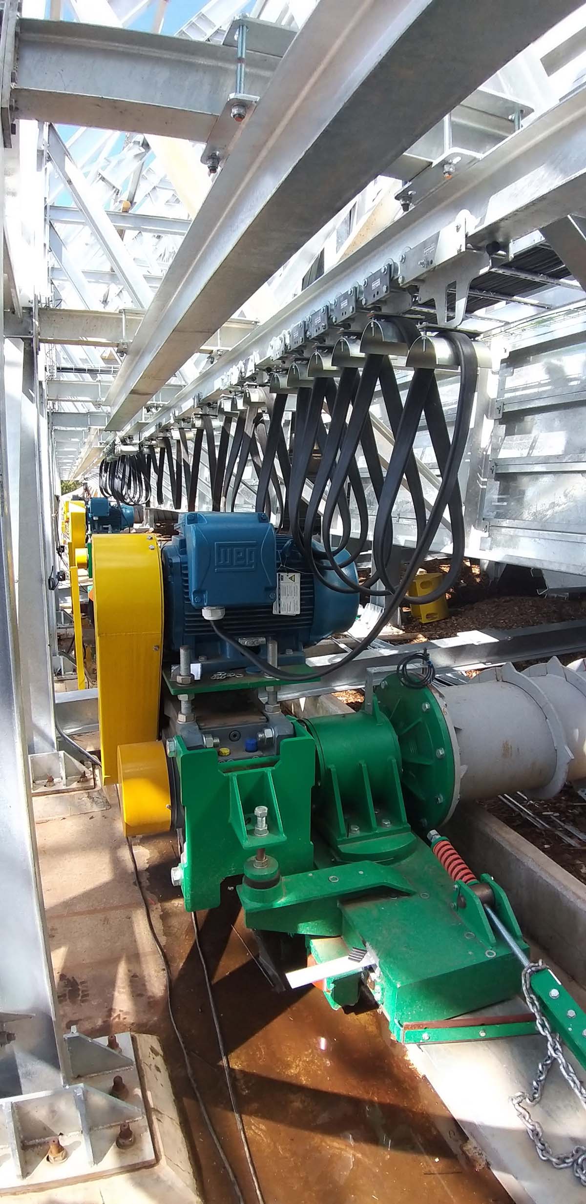 O sistema conta com acionamento hidráulico de translação, que desloca todo o conjunto da rosca varredora ao longo do trilho. Isso permite a varredura completa da rosca por todo o silo, com reversão automática do sentido de translação.