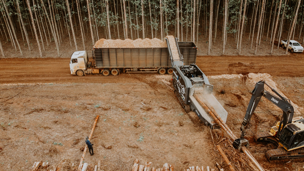 Indicado para eucalipto e pinus (árvore inteira e madeira traçada), supressão nativa, tocos e acácia, galhadas e casca.